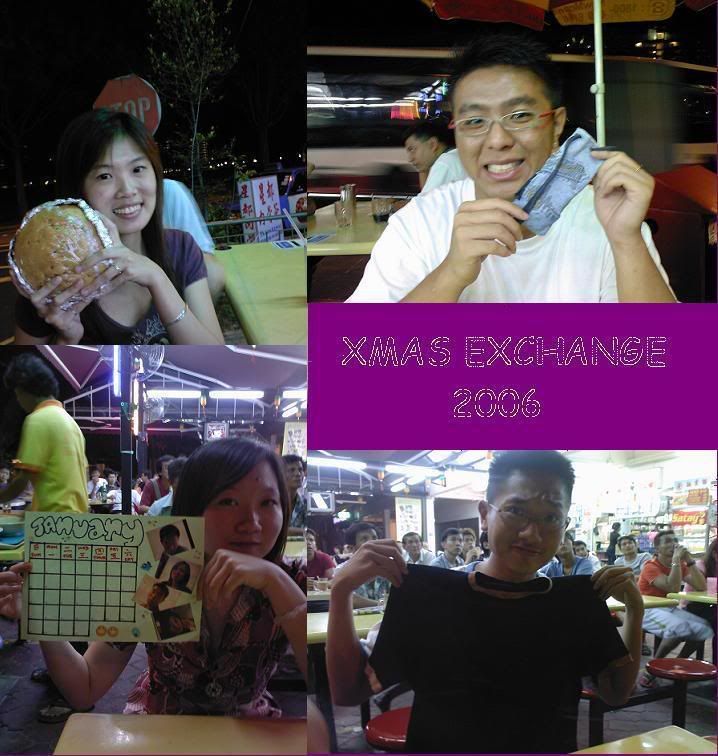 i got a cake.. hui: calendar for year 2007.. js: a hp pouch.. ky: a t-shirt.. hui bought e tee & bleached some designs on it.. =)